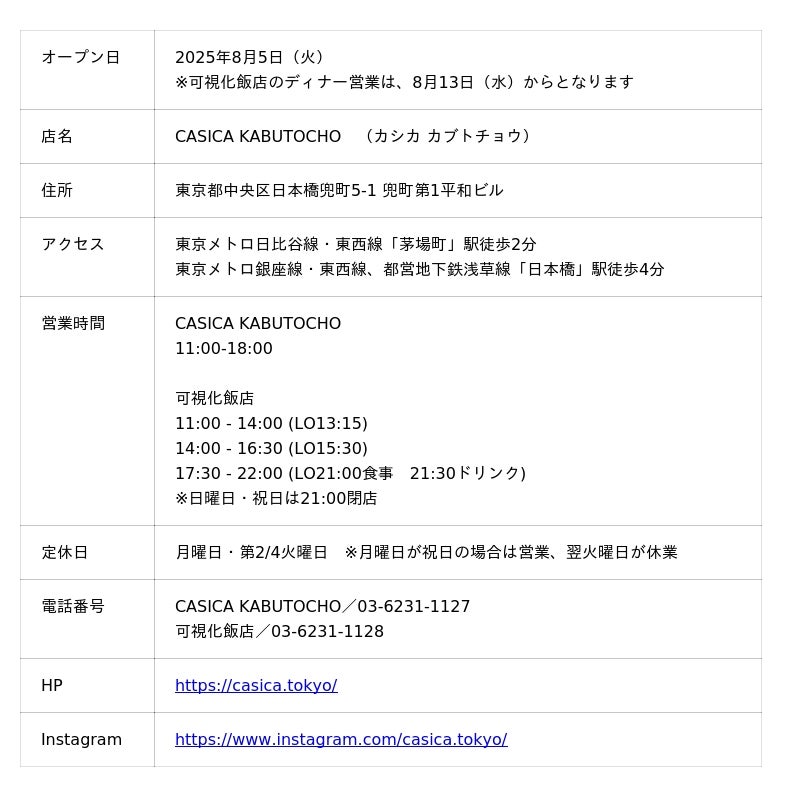 そして新たな第一歩として、2025年8月5日 (火)東京・日本橋兜町に新たな文化の交差点となる風豪型店舗「CASICA KABUTOCHO」をオープンいたします。