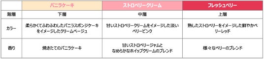 ふんわりとしたバニラケーキ、とろけるようなストロベリークリーム、みずみずしいフレッシュベリーをイメージした3つの甘い香りが層をなして重なり合い、まるでカットされたショートケーキの断面のような美しいグラデーションを描きます。見た目にも心ときめくデザインで、ひと目で甘く幸せな気分に。