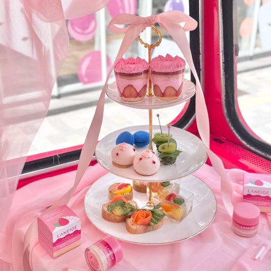 リップスリーピングマスクの新作〈ショートケーキフレーバー〉の発売を記念し、英国風アフタヌーンティーを楽しめる「ロンドンバスイベント」を期間限定で開催します。製品のビジュアルと、ショートケーキ仕立ての3層カラーでラッピングされたロンドンバスが、都内を優雅に巡回。車内では、本製品をイメージして開発されたオリジナルケーキや美容を意識したお食事を楽しみながら、香りや世界観を“味わう”体験をお届けします。