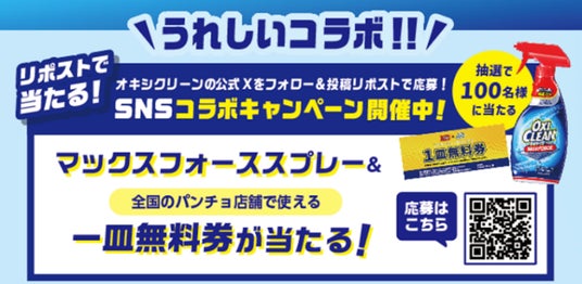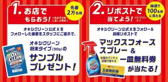 2025年8月1日(金)から全国のパンチョ25店舗でオキシクリーンお試し用サンプルを先着2万名様に、そしてオキシクリーン公式Xリポストで「マックスフォース スプレー」と「パンチョ一皿無料券」を抽選で100名様にプレゼントするキャンペーンがスタートします。さらに、オキシクリーンの“中の人”とパンチョ大王のコラボムービーにもぜひご注目ください。