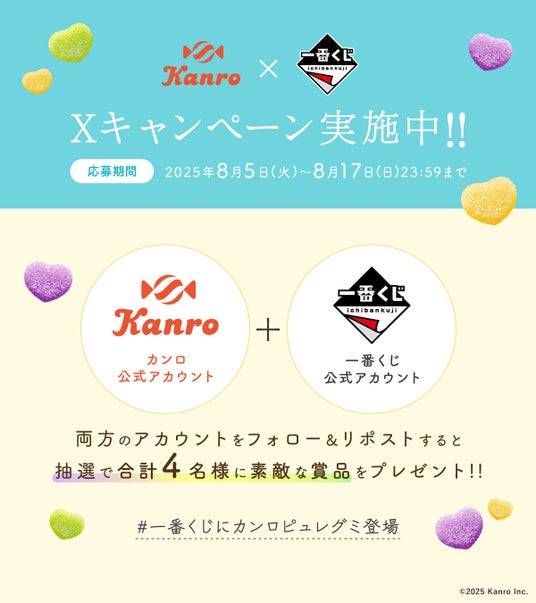 「カンロ」X公式アカウント(@kanro_pr)と「一番くじ」X公式アカウント(@ichibanKUJI)両方をフォローのうえ、該当期間中に「#一番くじにカンロピュレグミ登場」が付いた一番くじ公式アカウントの投稿をリポスト、もしくはキャンペーンハッシュタグを付けて商品に関する内容を投稿した方の中から抽選で4名様にカンロのお菓子と一番くじのグッズ詰め合わせをプレゼントするキャンペーンを実施します。