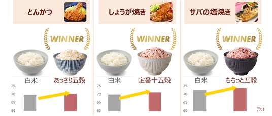 さらに、AI味覚分析※2でも「おこめプラスシリーズ」がおかずの美味しさを引き立てる効果が証明されました。「揚げ物」「味の濃い肉料理」「魚料理・煮物」といった食卓出現頻度の高いおかずとの組み合わせにおいて、相性度が白米を上回る結果に。この要因は、雑穀のブレンドによってごはんの味のバランスがより整い、おかずの旨みを最大限に引き出すことにあります。