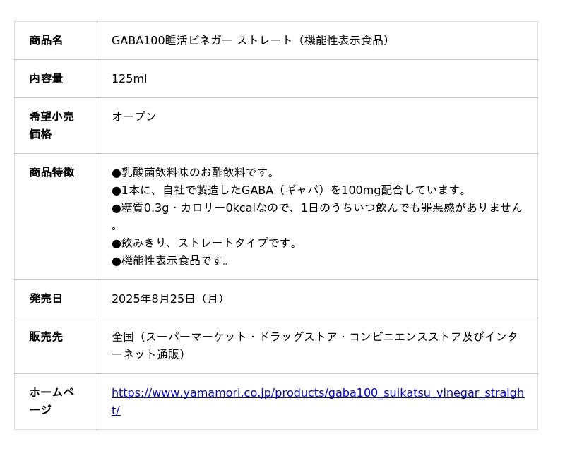総合食品メーカー、ヤマモリ株式会社(本社:三重県桑名市、社長:三林 圭介)は、「GABA100睡活ビネガー ストレート」(発売中)の消費者庁への機能性表示食品届出受理が完了し、2025年8月25日(月)よりパッケージをリニューアルして発売致します。本品は、「GABA100睡活ビネガー」をどこでも味わえる手軽な1杯分のストレートタイプです。