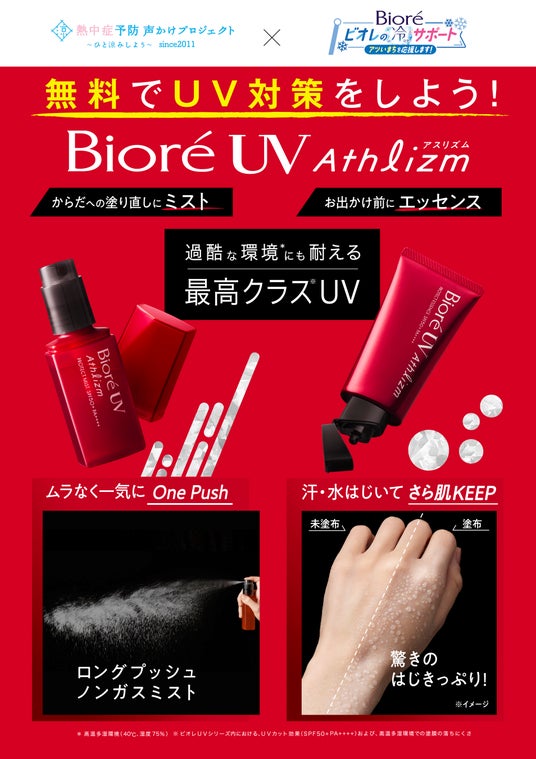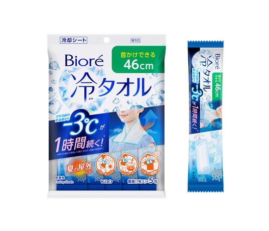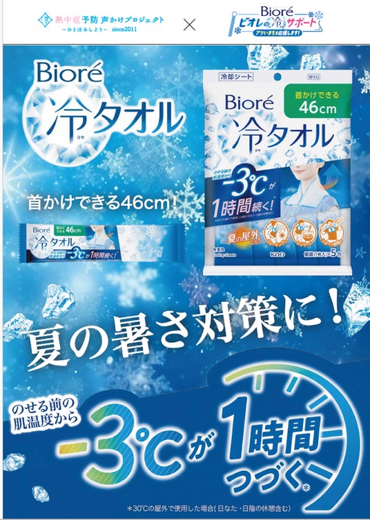 「ビオレ」は、暑熱環境下においても、多くの人々が夏を楽しく快適に過ごせるよう、肌にのせる前の肌温度から-3℃が1時間続く*3 冷却シート『ビオレ 冷タオル』を提案しています。本商品を、各地のイベントやスポーツ施設、レジャー会場、行政と連携したクーリングスポット等で配布・試用体験を提供していくことで、「暑熱対策」のサポートを続けてきました。