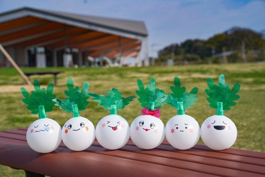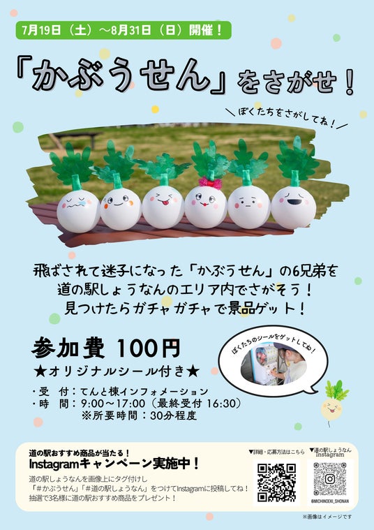 風に飛ばされた迷子の「かぶうせん」6人兄弟を道の駅しょうなんのエリア内をまわって探してみよう!見つけたらガチャガチャでオリジナルシールゲット!また、「かぶうせん」を見つけて、Instagramに投稿すると抽選で道の駅おすすめ商品が当たるキャンペーンも実施中!