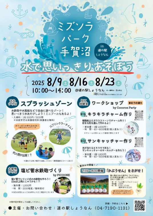 「水で思いっきりあそぼう」をテーマに、道の駅しょうなんの水と空を感じられる特別空間「ミズソラパーク手賀沼」を8月の土曜日に3回開催します!道の駅の各エリアでいろいろなイベントを実施しますので、ぜひご家族やご友人とお越しください!