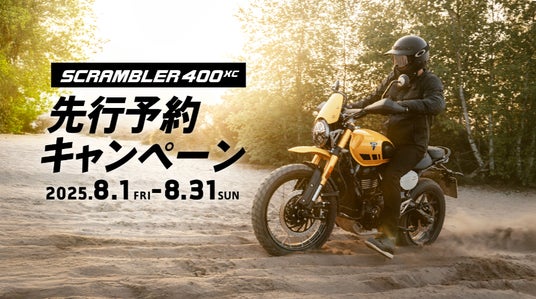 トライアンフモーターサイクルズジャパン株式会社(代表取締役社長:大貫 陽介、東京都港区)は、2025年8月1日(金)から8月31日(日)までの期間中、トライアンフの400ccモデル「SCRAMBLER 400 XC」を対象とした「SCRAMBLER 400 XC 先行予約キャンペーン」を実施することをお知らせします。