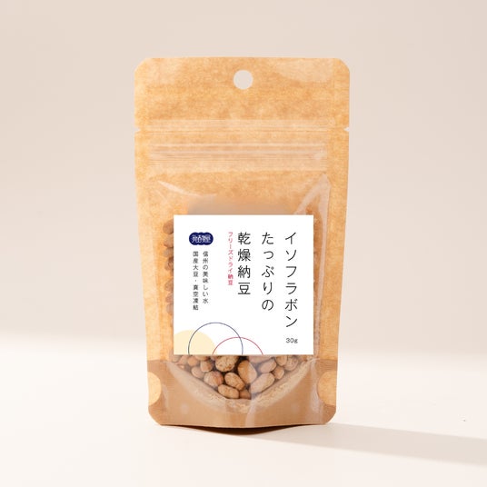 発酵食品の王様である「納豆」高い栄養価と機能性を有する一方で、匂いや粘りが苦手という声は少なくありません。私たちはその壁を越え納豆の持つ発酵の力をもっと多くの方に届けたいと考えました。そのため、納豆本来の機能性を維持・強化しながら、食べやすさを両立する開発を目指しました。その開発の結果うまれたのが“イソフラボンたっぷりの乾燥納豆”です。信州地方の発酵食品加工技術をベースに、発酵臭や粘りを抑える低温乾燥法を採用し、誰にとっても食べやすい味と形に仕上げました。さらに、*ナットウキナーゼ活性は約140%向上、イソフラボンは300%以上、ビタミンK₁も250%以上増加(生納豆比)するなど、機能性成分の向上も確認されています。原料も信州にこだわり、長野県産の小粒大豆「スズロマン」と国産天日塩のみを使い、余計な添加物は一切使用していません。納豆の発酵力を活かし、日常の中で、無理なく"整う習慣"として取り入れていただけるよう開発した一品です。*日本分析センター調べ