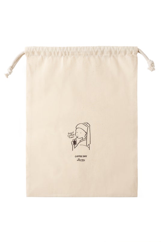 今回のコラボレーションを記念して、COFFEE BOY氏による直筆メッセージ「GOOD COFFEE TIME!(しあわせなコーヒー時間を)」をあしらった、リバーズオンラインストアとリバーズ公式楽天市場店限定の巾着も販売。小物入れとしてちょうどいいサイズ感です。