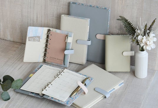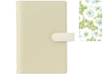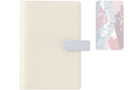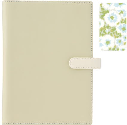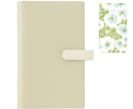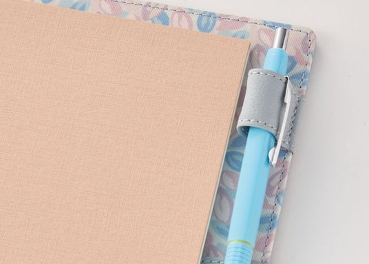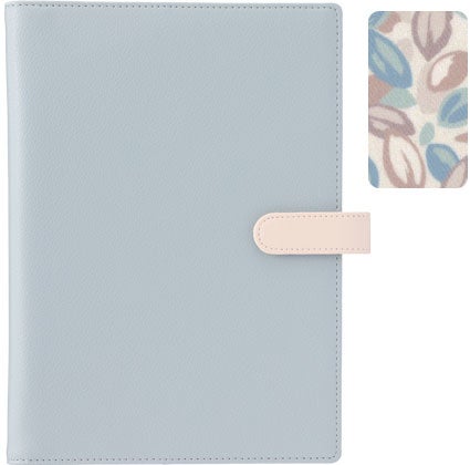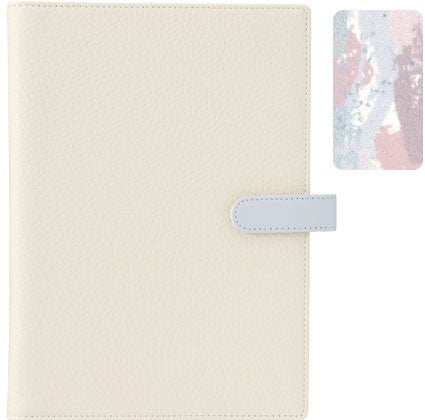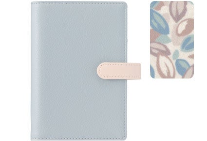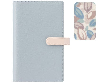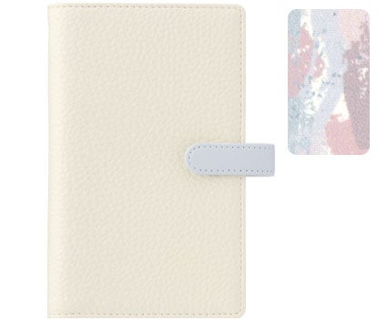 今回のカバーはどんなシーンでも持ちやすい、淡色でくすみカラーの3色展開。表面のシボや内側の柄は色ごとに異なるデザインです。柄はペイント柄や植物柄をチョイス。さらに、ホックベルトはカバーと異なるカラーで、遊び心のあるカジュアル系システム手帳となっています。