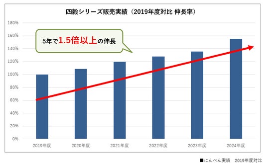 既存品「四穀シリーズ」は、「四穀しあわせ醤油(ごま・あわ・ひえ・きび使用)」に、かつお節だしを加えることで、マイルドな味わいに仕上げた、特定原材料等8品目不使用の食物アレルギー配慮型調味料シリーズです。つゆ、白だし、ぽん酢、ごまドレッシングの4種類を、2006年3月より順次発売開始しました。2024年度の販売実績は2019年度比で販売実績は1.5倍以上の成長を遂げており、アレルギー配慮型調味料への需要が継続して存在することが明らかになりました。