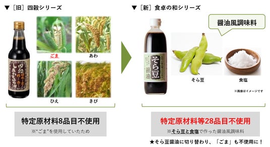商品仕様として、従来のごま・あわ・ひえ・きびを使用していた醤油原料を見直し、そら豆と食塩で造った醤油風調味料「そら豆醤油」にリニューアルすることで、ごまが外れ、特定原材料等28品目不使用対応となりました。