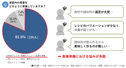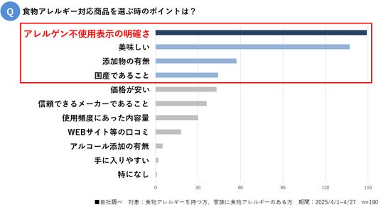 食物アレルギーを持つ方、もしくはそのご家族を対象にアンケート調査を行ったところ、家庭内の献立考案や調味料選びに悩まれている方が多いことが明らかになりました。なかでも重視されていたのは「アレルゲン不使用表示の明確さ」であり、使い方や献立提案までを含めた情報発信や、商品を手に取った際に一目でわかる視認性の高さ・安心感の訴求が求められていることがうかがえます。