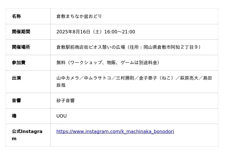株式会社クラビズ(本社:岡山県倉敷市、代表:秋葉優一)を事務局とする倉敷まちなか盆おどり実行委員会は、2025年8月16日(土)、倉敷駅前商店街 ビオス憩いの広場に櫓(やぐら)を建て、第2回『倉敷まちなか盆おどり』を開催します。