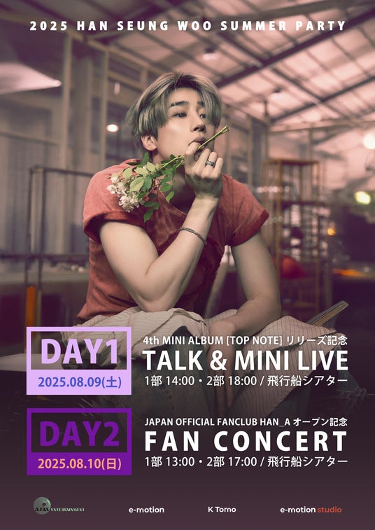 今回は「2025 HAN SEUNG WOO SUMMER PARTY」と題し、8月9日は「th MINI ALBUM [TOP NOTE] リリーズ記念 TALK & MINI LIVE」で新曲の披露やトークショー、そして8月10日はファンクラブのオープンを記念し、「JAPAN OFFICIAL FANCLUB HAN_A オープン記念 FAN CONCERT」として、さまざまなパフォーマンスやスペシャルなイベントを用意している。