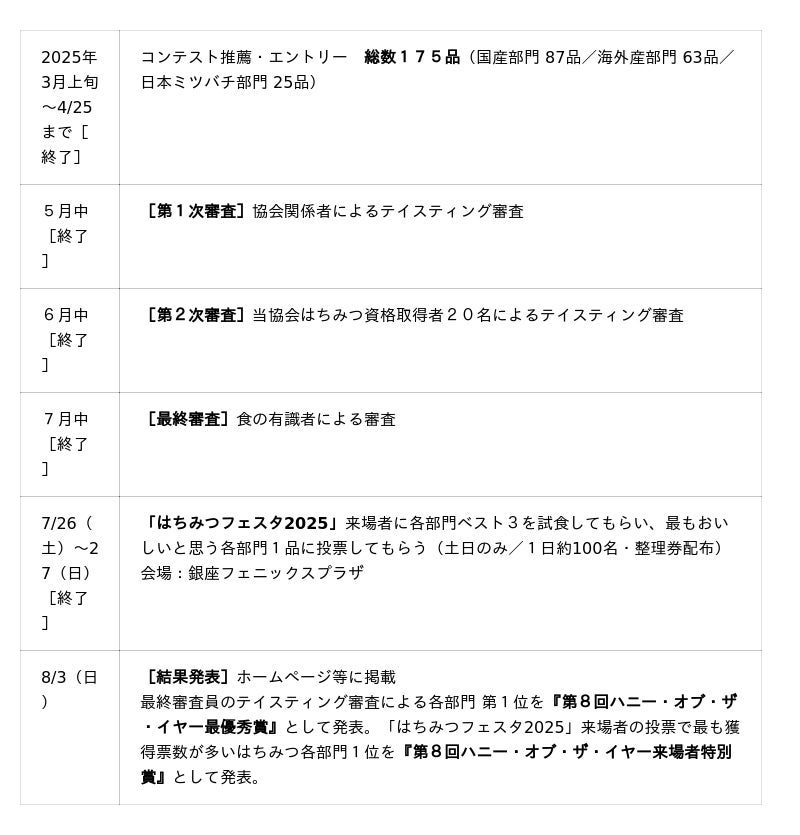 この度、7月中旬の有識者による最終審査、および7/26(土)・27(日)に銀座で開催した「はちみつフェスタ2025」来場者による試食投票の結果、最優秀賞・来場者特別賞が決定しましたのでお知らせ致します。