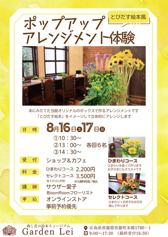 広島県世羅町「森と花の絵本ミュージアムGardenLei」にてフラワーアレンジメント体験を行います。オリジナルの本型ボックスにひまわりをアレンジしてとびだす絵本風に作ります。お子さまもご参加いただけるコースをご用意していますので夏休みの体験にご来館ください。専属フローリストがアドバイスいたしますので初めての方も安心してご参加いただける体験です。涼しくレトロな洋館内で行います。