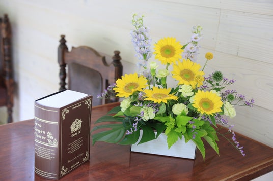 オリジナルの本型BOXにひまわりをアレンジしてとびだす絵本風に