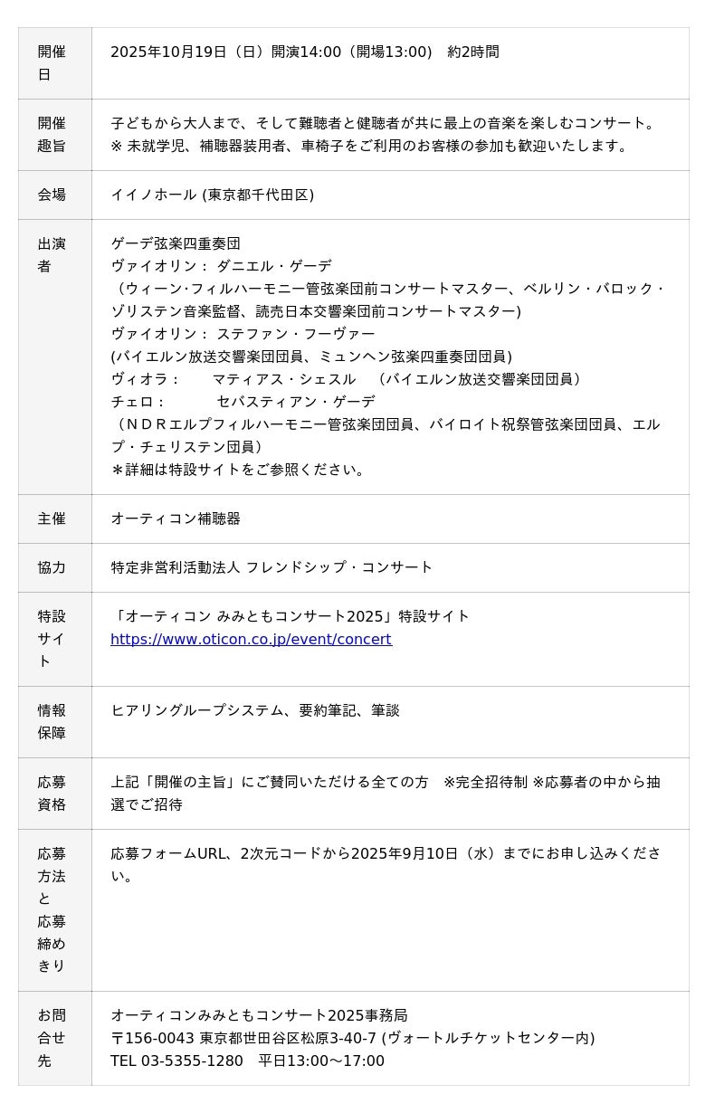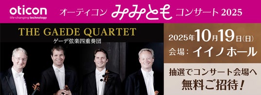 今年の演奏者は、ウィーン・フィルの前コンサートマスター、ダニエル・ゲーデ氏が率いる「ゲーデ弦楽四重奏団」です。演奏者の詳細については、特設サイト(https://www.oticon.co.jp/event/concert )をご覧ください。お申し込みは、特設サイト上の応募フォームにて本日より9月10日(水)まで受付けています。
