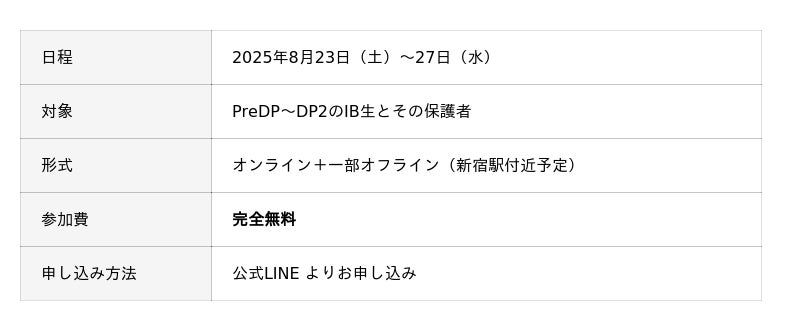株式会社Linksenpaiが運営するIB専門塾「IBアカデミー」は、IBDP生と保護者向けに、スコアアップと進路相談を両立できる完全無料の夏期講習を8月23日~27日に開催します。