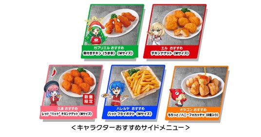 「骨付きチキン(うま辛)(Mサイズ)」、「チキンナゲット(Mサイズ)」、「レッド“ハット”チキンナゲット(Mサイズ)」「ハットフライポテト(Mサイズ)」、「もちっと!ハニーフォカッチャ(8個入り)」の5種類