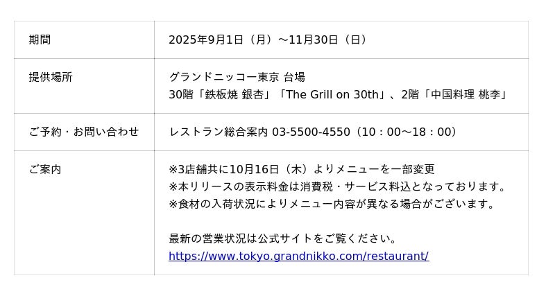 「東京を楽しむ 東京をくつろぐ」ひとときをお届けするグランドニッコー東京 台場(住所:東京都港区 総支配人:塚田 忠保)は、「鉄板焼 銀杏」「The Grill on 30th」「中国料理 桃李」にて、『ガストロノミープラン ~青森フェア~』を2025年9月1日(月)~11月30日(日)の期間限定で開催いたします。