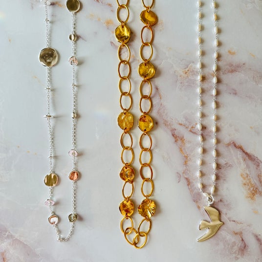 ベルトやY字ネックレスとしてもアレンジができるロングネックレスは、定番のシルバーやゴールド素材の他、涼しげなガラス使いのものまでバリエーションを揃えて展開します。小さなメタルが連なった「千夜一夜」や、曲線のメタルとガラスとのリズミカルなコンビネーションが個性的な「アラベスク」など、お気に入りを探すことができる機会となります。