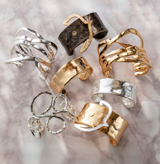 Tシャツに合わせるだけで様になる太めのバングルは、ゴールドかシルバーかブロンズのカラーバリエーション。