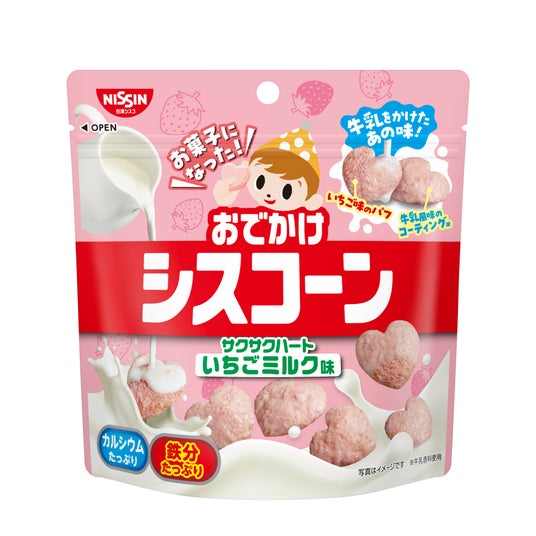 「おでかけシスコーン サクサクリング チョコミルク味」は、サクサクした食感でコク深いチョコレート味のリング状パフを牛乳風味のチョコレートコーチング*2で包み込みました。「おでかけシスコーン サクサクハート いちごミルク味」は、サクサクした食感で甘酸っぱいいちご味のパフを牛乳風味のチョコレートコーチング*2で包み込みました。どちらの商品も、不足しがちなカルシウムと鉄分をたっぷり配合しています。