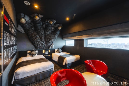 【ゴジラルーム】 全1室(シングルベッド2台<定員2名>、32平方メートル )リアリティあふれるゴジラがお部屋に!トリックウォールなど仕掛け満載