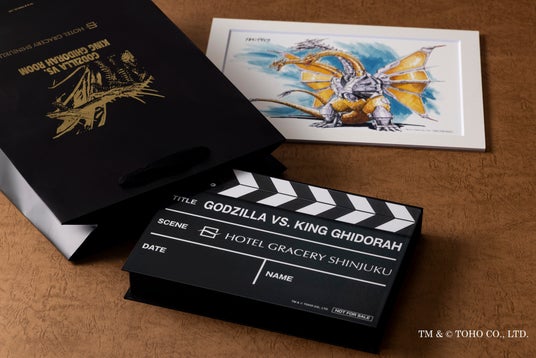 ◎ノベルティ概要 [1]西川伸司氏によるメカキングギドラのデザイン画1種、ゴジラ・キングギドラのイメージ画1種、特撮ルームをテーマとしたカチンコ箱セット(台本ノート、『ゴジラVSキングギドラ』をモチーフにしたデザインのステッカー4種やメタリックポストカード4種)