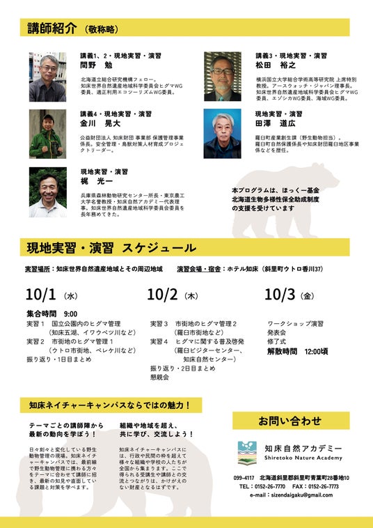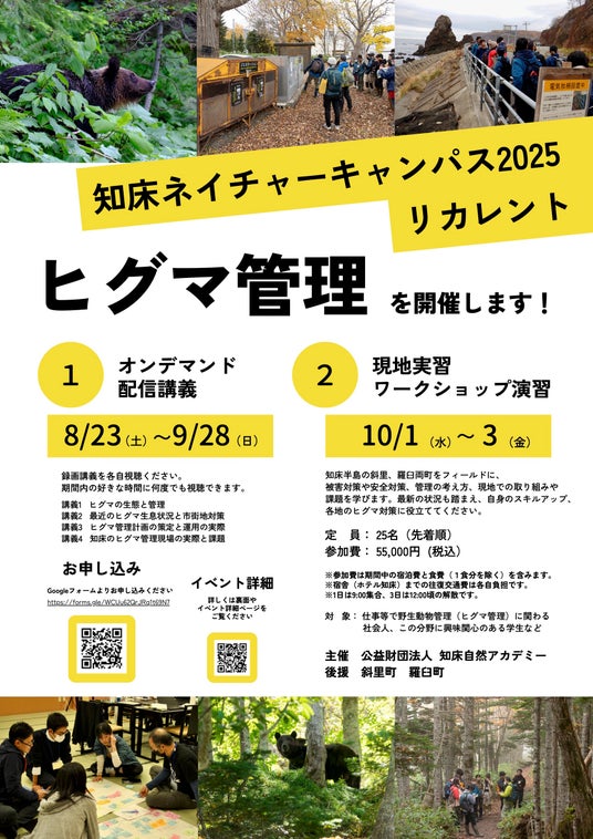 公益財団法人 知床自然アカデミー(所在地:北海道斜里町、代表理事:梶光一)は、2025年8~10月に社会人向けプログラム「知床ネイチャーキャンパス2025リカレント ヒグマ管理」を開催し、受講生を募集しています。