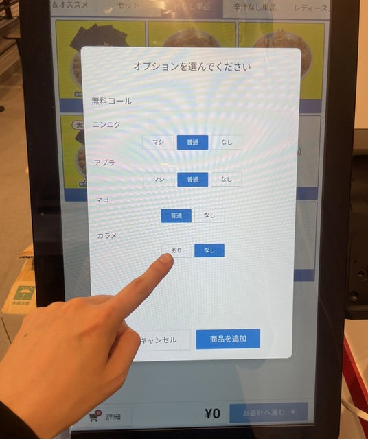 券売機の全面リニューアルにより、「ニンニク」「アブラ」「カラメ」「マヨネーズ」などのトッピング指定がすべて券売機上で完結するようになりました。