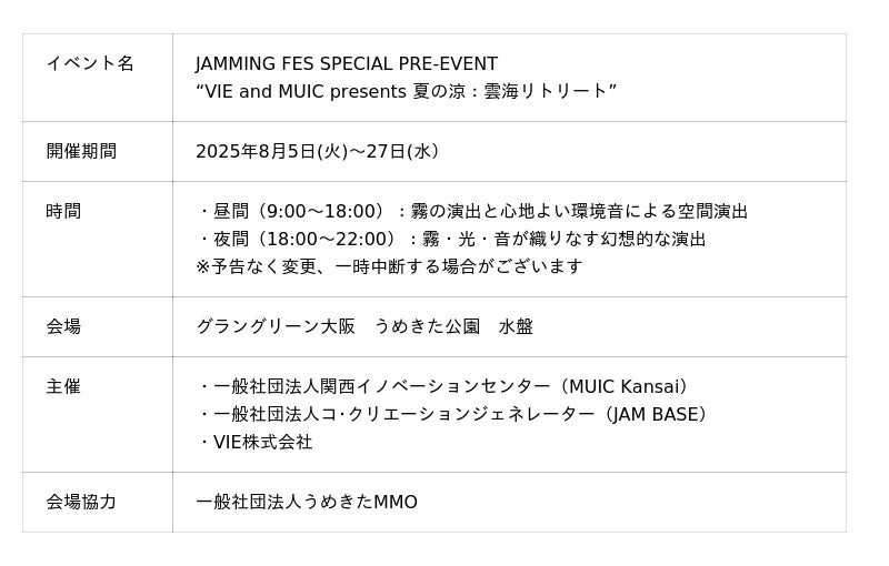 MUIC Kansaiを運営する一般社団法人関西イノベーションセンター(理事長 早乙女 実、以下 MUIC)は、JAM BASEを運営する一般社団法人コ・クリエーションジェネレーター(代表理事 高橋 豊典、以下 JAM BASE)、次世代型ウェアラブル脳波計の開発とニューロテクノロジーの社会実装を行うVIE株式会社(代表取締役 今村 泰彦、以下 VIE )と共に、グラングリーン大阪にて「JAMMING FES SPECIAL PRE-EVENT “VIE and MUIC presents 夏の涼:雲海リトリート”」(以下 本イベント)を、2025年8月5日(火)~27日(水)の期間限定で開催いたします。