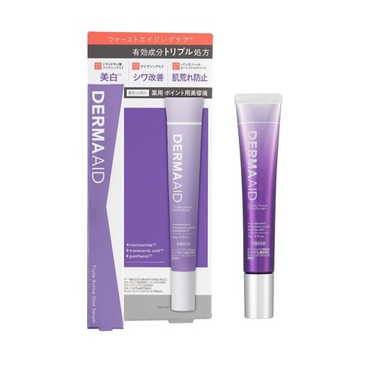 ダーマエイドは3つの有効成分「ナイアシンアミド」「トラネキサム酸」「D-パントテニルアルコール」を配合したシワ改善有効成分配合の医薬部外品シリーズ。あらゆる年齢サインをカバーして、総合的なケアが叶うようにという思いを込めて作った、今注目のスキンケアブランドです。また、美白効果を持つ有効成分「トラネキサム酸」、美白効果とシワ改善効果のある有効成分「ナイアシンアミド」、さらに肌荒れ防止有効成分「パンテノール」という希少な組み合わせで配合し、気になる肌悩みにトリプルアプローチできることが特長です。