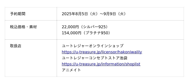 株式会社ユートレジャー(本社:東京都新宿区、代表取締役社長:青木 興一、株式会社ケイ・ウノの連結子会社)は、女性ユニット「ハコニワリリィ」とコラボレーションした「リングネックレス」の予約受付を2025年8月5日(火)~9月9日(火)の期間、ユートレジャーオンラインショップ、ユートレジャーコンセプトストア池袋にて行います。