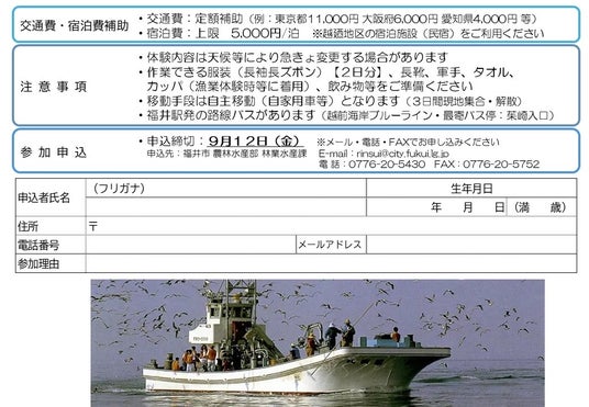 ”福井市で漁業生活”を体験!漁業のプロから学ぶ3日間【10/8(水)~10/10(金) 】「ちびっと就漁事業」参加者募集中!【先着3名・9/12 応募〆切】県外在住の方には、交通費・宿泊費助成します!
