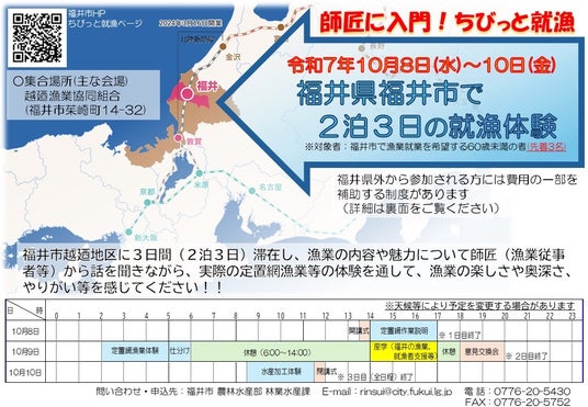 福井市では本年度より、減少傾向にある漁業の担い手確保に向け、新事業としてプロのもとで体験できる3日間の就業体験プログラム、題して「ちびっと就漁事業」を始動します。