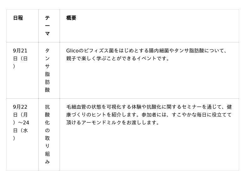 本イベントでは、腸内環境の改善やカラダの酸化を防ぐなど、健康的な生活習慣の促進を目指し、Glicoの科学的な知見に基づいたプログラムを実施します。タンサ脂肪酸について子どもたちが楽しく学べるイベントや、自分の毛細血管の様子を観察する体験と抗酸化をテーマとしたセミナーなどを通じて、来場者が日常生活に役立つ知識に触れ、健康への意識を高め、実践につなげるきっかけを提供します。