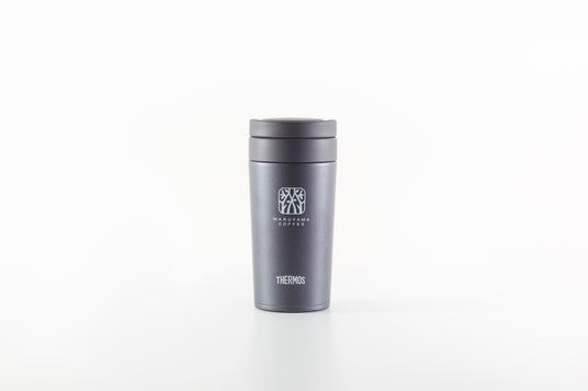 メタリックグレーの本体に丸山珈琲のロゴをあしらったサーモスのマグボトルです。ステンレス製の魔法びん構造でホットとアイスの両方に対応しており、飲み頃温度を長時間キープします。蓋部分には折りたためるキャリーハンドルが付いているため、ちょっとした持ち運びにも大変便利です。