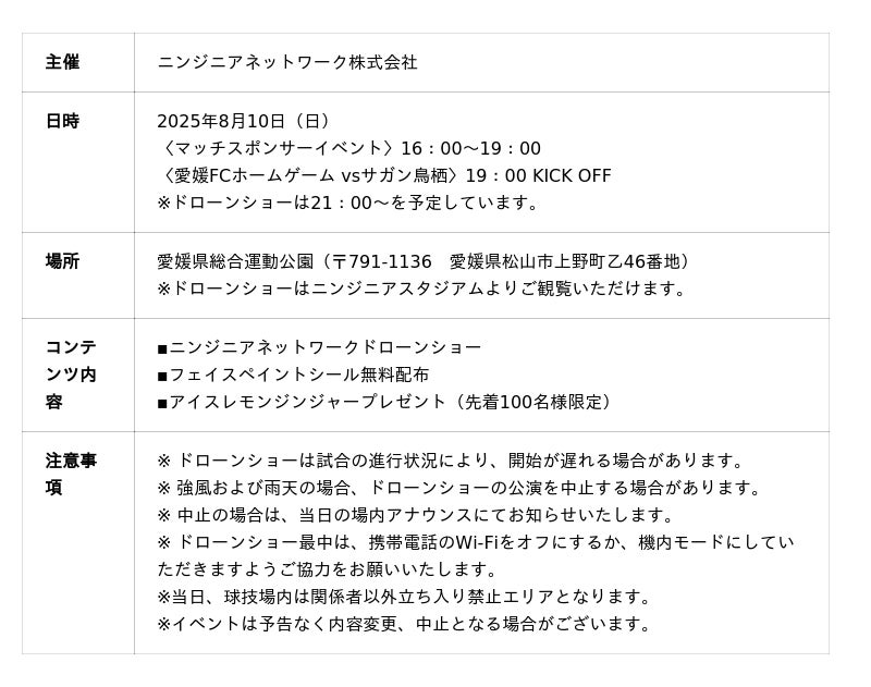 この度、J2リーグのクラブチーム「愛媛FC」のメインスポンサーであるニンジニアネットワーク株式会社(本社:愛媛県伊予市、代表取締役社長:村上 忠)は 、「空飛ぶクルマ」の開発及びドローン関連サービスを提供する株式会社SkyDrive(本社:愛知県豊田市、代表取締役CEO:福澤知浩)とのコラボレーションによる、一夜限りのドローンを活用したエンターテインメントショーを8月10日(日)愛媛FC vs サガン鳥栖戦の試合終了後に開催いたします。