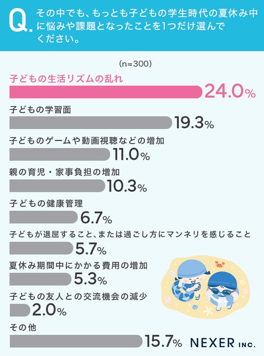 その中でも、もっとも子どもの学生時代の夏休み中に悩みや課題となったことを1つだけ選んでもらいました。
