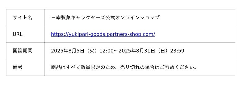 この2つの記念日に合わせ、ぱりんこと雪の宿の公式キャラクターグッズを数量限定でオンライン販売する「三幸製菓キャラクターズ公式オンラインショップ」を2025年8月5日(火)から2025年8月31日(日)の期間限定でオープンいたします。