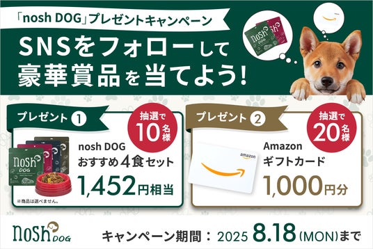 「世界中の人々が健康で豊かに生活できる未来を届ける。」をミッションに掲げ、手軽に美味しく栄養管理ができる冷凍宅配食サービス「nosh(ナッシュ)」を提供するナッシュ株式会社(本社:大阪市、代表取締役:田中 智也)は、2025年8月5日(火)から8月18日(月)までの期間限定で、抽選で10名様に「nosh DOGおすすめ4食セット」(※)または20名様に「Amazonギフトカード1,000円分」が当たるプレゼントキャンペーンを実施します。