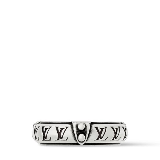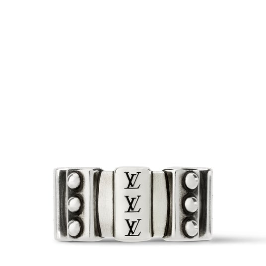 ブラックのパティーナ(陰影)を丁寧に施して贅沢に仕上げた「リング・LV ロジン」。トランク製造における卓越したクラフツマンシップから着想を得たこのアイテムは、複数の丸みのあるスタッズを定番の一連に配したLV イニシャルで囲んだデザインが特徴です。