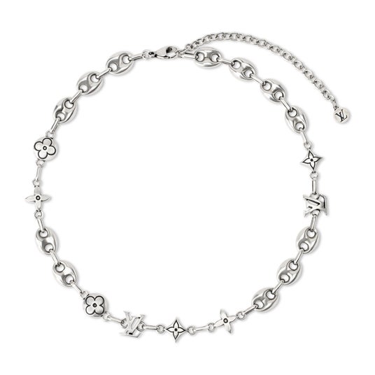 「ネックレス・LV セーラー ミディアムチェーン」のノーティカル・マイヨンチェーンを彷彿させる一連のリンクは、カットアウトのディテールを施したメダリオンシェイプやモノグラム・フラワー、LV イニシャルでつなぎ合わせています。ブラックのパティーナ(陰影)が刻印されたディテールを引き立てる、長さ調節可能な一品。
