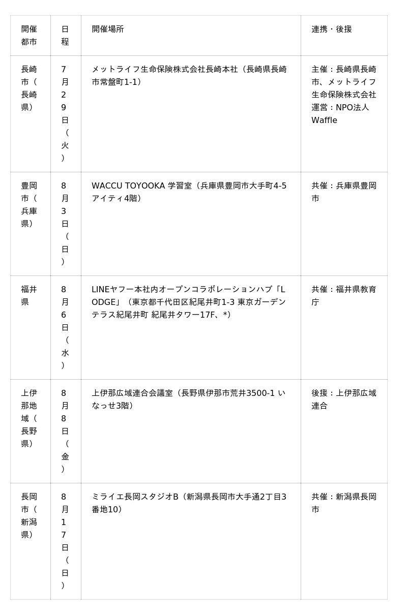 各開催地域の自治体や企業との連携のもと、地域に根ざした継続的な開催が広がっています。本年度も、過去に実施実績のある地域を中心に、より強固な協働体制のもとで実施し、地域の特性を活かしたプログラムを提供します。