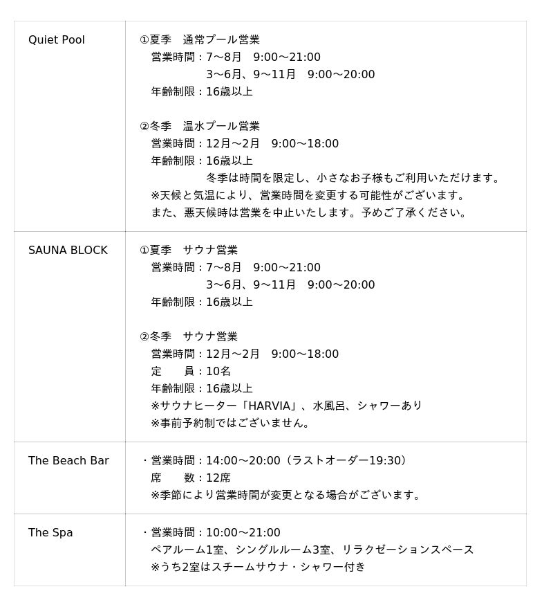 大人専用のインフィニティプール「Quiet Pool」には、国内で初めて採用したクリエイティブサウナ集団TTNE社監修の本格的なサウナ「SAUNA BLOCK」「The Beach Bar」を備えており、16歳以上の年齢制限を設け営業いたします。