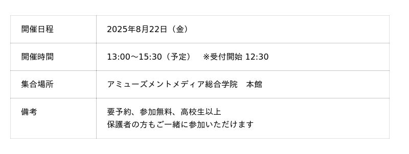 さらに、「エンタメ業界に興味はあるけれど、希望の職種や学科が決まらない」という方へ向けた「AMG学校説明会」も開催。業界全体のお話を交えながら、AMGで学べることやエンタメのお仕事の魅力について学院スタッフが詳しく説明させていただきます。