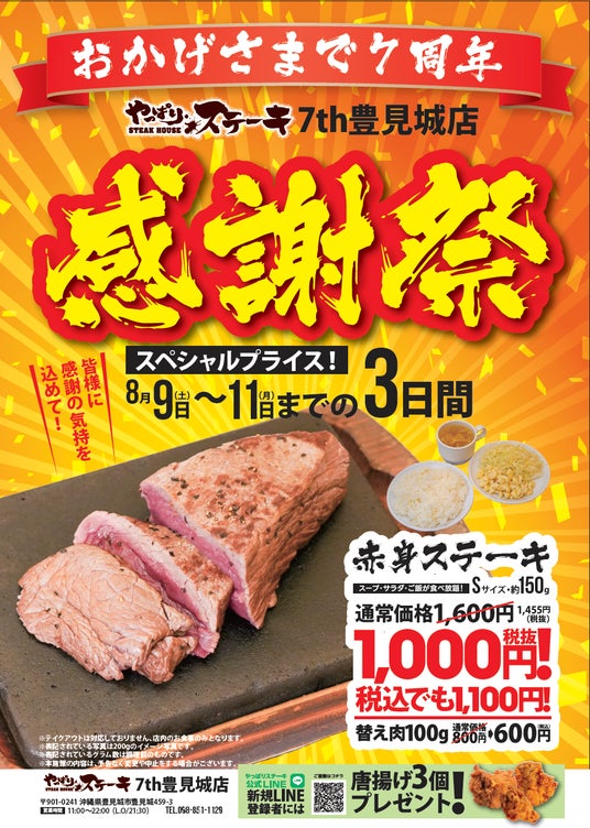 【やっぱりステーキ】7th 豊見城店がオープンから7周年!日頃のご愛顧に感謝の気持ちをこめて8月9日から3日間お得な感謝祭を開催!